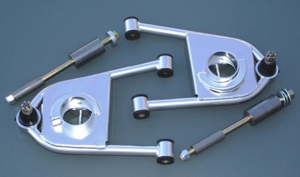 The lower control arms are made of heavy 3/16″ wall DOM steel. Each is hand TIG welded and finished with urethane bushings, screw in heavy duty ball joints and all attachment hardware. They come in standard length or 5/8″ narrowed and ship raw steel.
